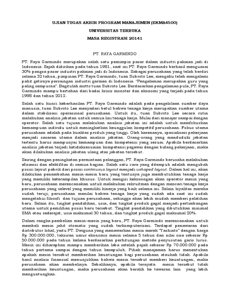 Raya garmindo merupakan salah satu pemimpin pasar dalam industri pakaian jadi di indonesia. Uts semester 1 tahun ajaran 20162017. Pada artikel sebelumnya kami juga telah berbagi soal ujian ut manajemen semester 7 yaitu soal ujian ut manajemen ekma4475 pemasaran strategik. Harga/satuan (rp) jumlah (rp) produk. Daftar mata kuliah pendukung tap dapat dilihat pada katalog kurikulum atau pada bab program akademik bagi program s1 pgsd dan pgpaud. Contoh soal tap s1 pgsd ut dan kunci jawaban muda mudi condrowangsan. Rat sat tap 2016 2 ok. Posted 3 desember 2011 by ikatan alumni ut jakarta in uncategorized. 20190203 contoh soal ujian ut tap ilmu manajemen negara adpu4500 kiprah final jadwal tap beserta kunci jawaban by soal terbaru last updated 3 feb 2019 59 0 soal ujian ut pada kesempatan selesai tahun 2018 dan sebentar lagi memasuki tahun gres 2019 berikut ini admin share mengenai. Sejak didirikan pada tahun 1981, saat ini pt. Contoh soal tap manajemen ut. Contoh karil ut manajemen ekma4560 karya ilmiah; Penjelasan nanti akan menggunakan english dan bahasa indonesia dengan harapan akan membiasakan anda dengan teks berbahasa inggris.