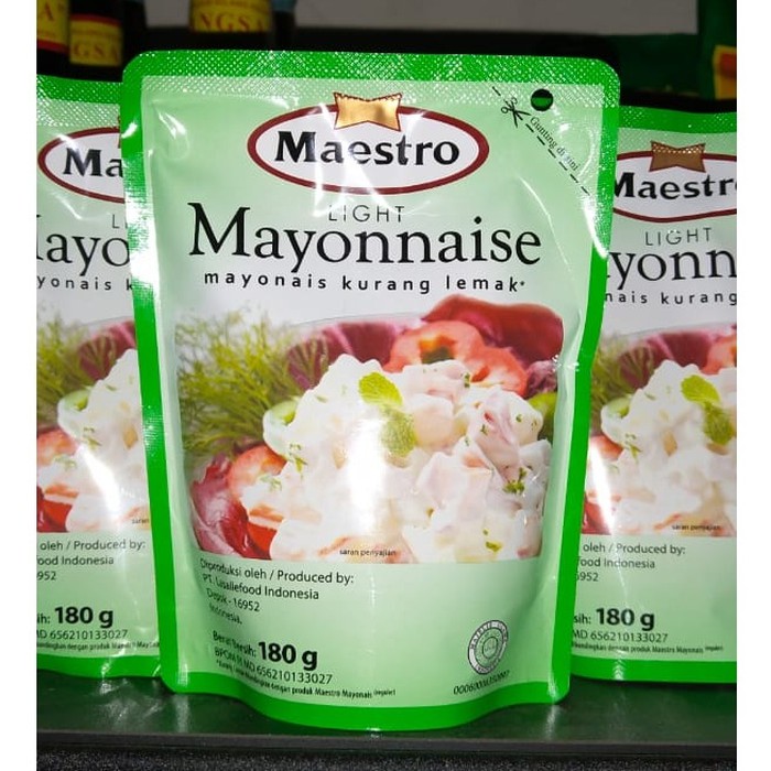 Kalori sebesar itu berarti 10% dari kebutuhan . Jual maestro light mayonnaise / mayonais 180 gr . Mayones terbaik lasallefood maestro mayonnaise. Saat makan ham atau salad, sering kali kita dihadapkan dengan aneka ragam saus. Maestro mayonais pedas dibuat dari perpaduan mayonais dengan saus sambal nikmat yang menghasilakan mayonais dengan cita rasa pedas yang creamy.