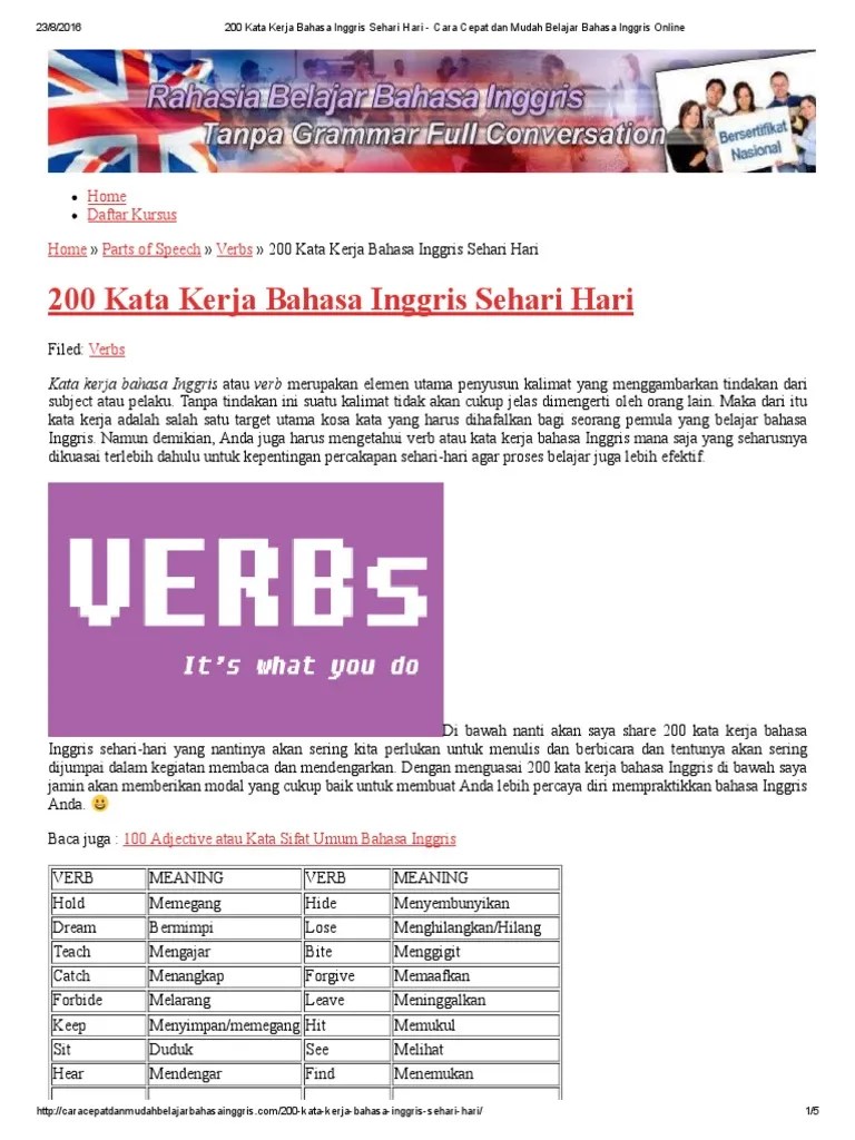 Silahkan dihafalkan kosa kata tersebut. Daftar 100 kosa kata yang paling sering digunakan dalam bahasa inggris ini dapat digunakan sebagai referensi untuk pembelajar bahasa inggris pemula. 100 kata kerja (verbs) yang paling sering digunakan beserta artinya | yureka education center 50 kata kerja dalam bahasa inggris beserta . Kata kerja dalam bahasa inggris · accept: Kata kerja dalam bahasa inggris disebut sebagai verbs. Coba lihat kumpulan kata kerja paling sering muncul ini, baik di dalam . Seperti membaca, ketika mendengar kata yang baru, . Di bawah ini merupakan 100 kata kerja yang paling sering digunakan beserta artinya. Pada postingan kali ini, admin akan memberikan 100 kosa kata tentang kata kerja (verb vocabulary). Daftar 100 kata yang paling sering digunakan dalam bahasa inggris . Diperkirakan 300 juta orang berbahasa inggris sebagai bahasa kedua, dan 100 juta orang menggunakannya dengan lancar sebagai bahasa asing. Berbicara dengan orang lain dapat membantu anda untuk menemukan kata baru. Berikut ini adalah 100 kata kerja bahasa inggris (verbs) paling.